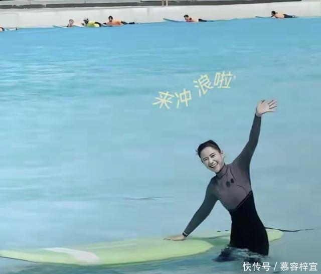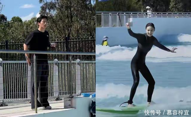 最逗的还是冲浪环节。酒店里有个人工冲浪池,何超莲换上连体泳衣就下水了。窦骁没下水,穿着黑衣服在岸上站着,表情看着有点紧张,眼睛就没离开过老婆。何超莲玩嗨了,冲浪板掉了耳朵进水,她歪着头在那倒水,完事儿还像个小孩似的朝窦骁挥手。整个状态特别放松,就是在自己地盘上撒欢的感觉。窦骁就那么在边上守着,还拿手机给她拍视频,视频里还能听到他的笑声。